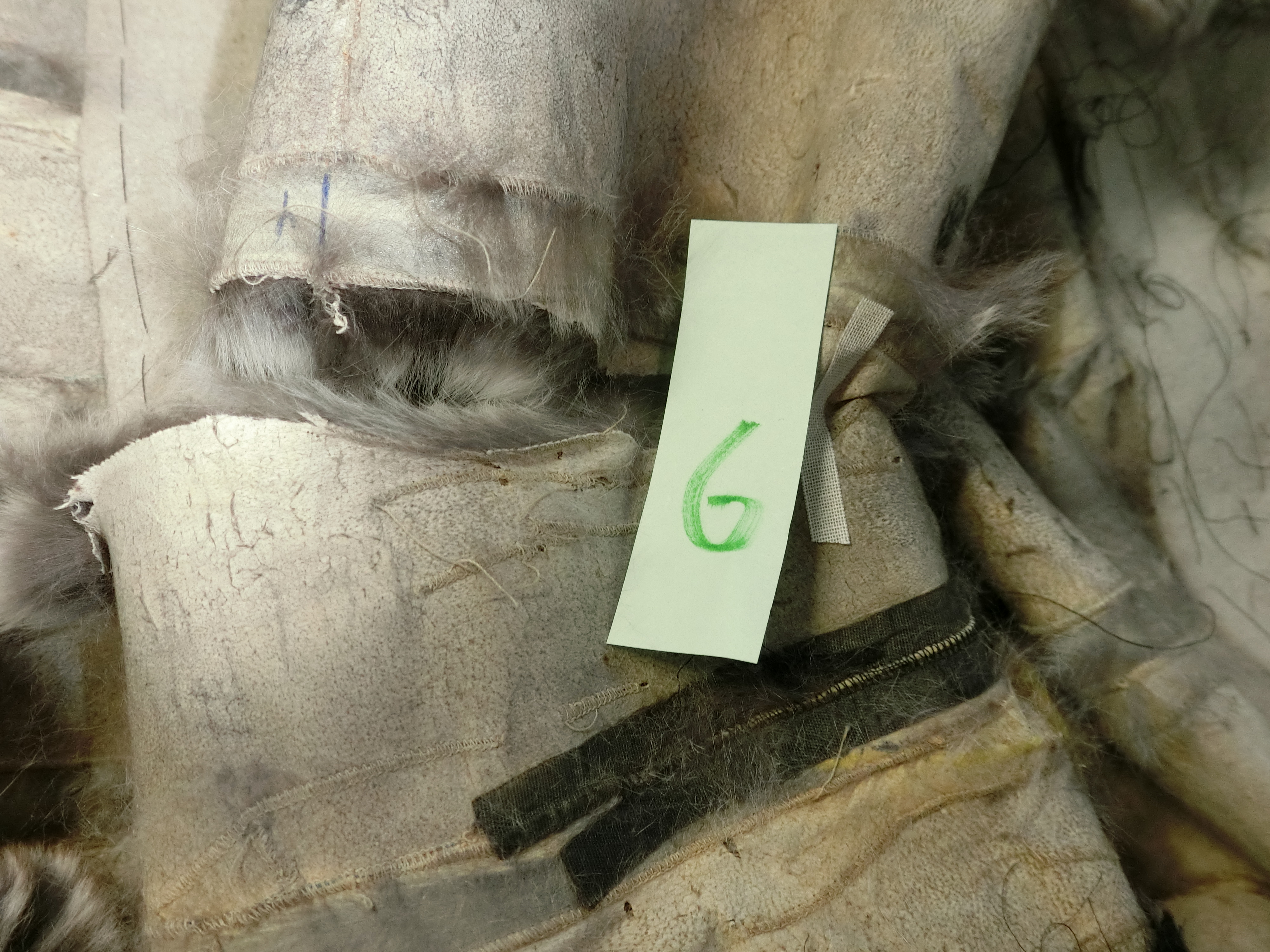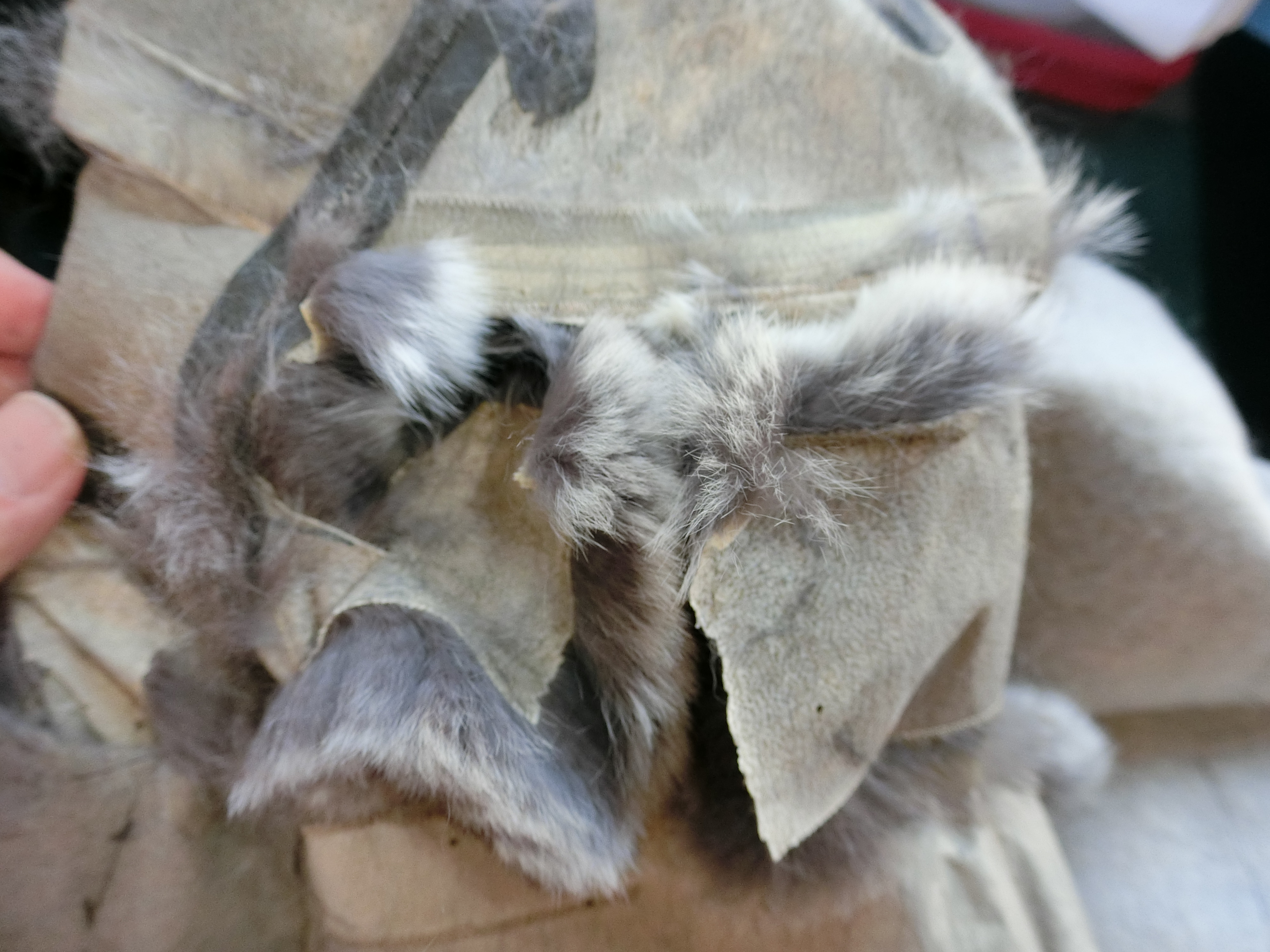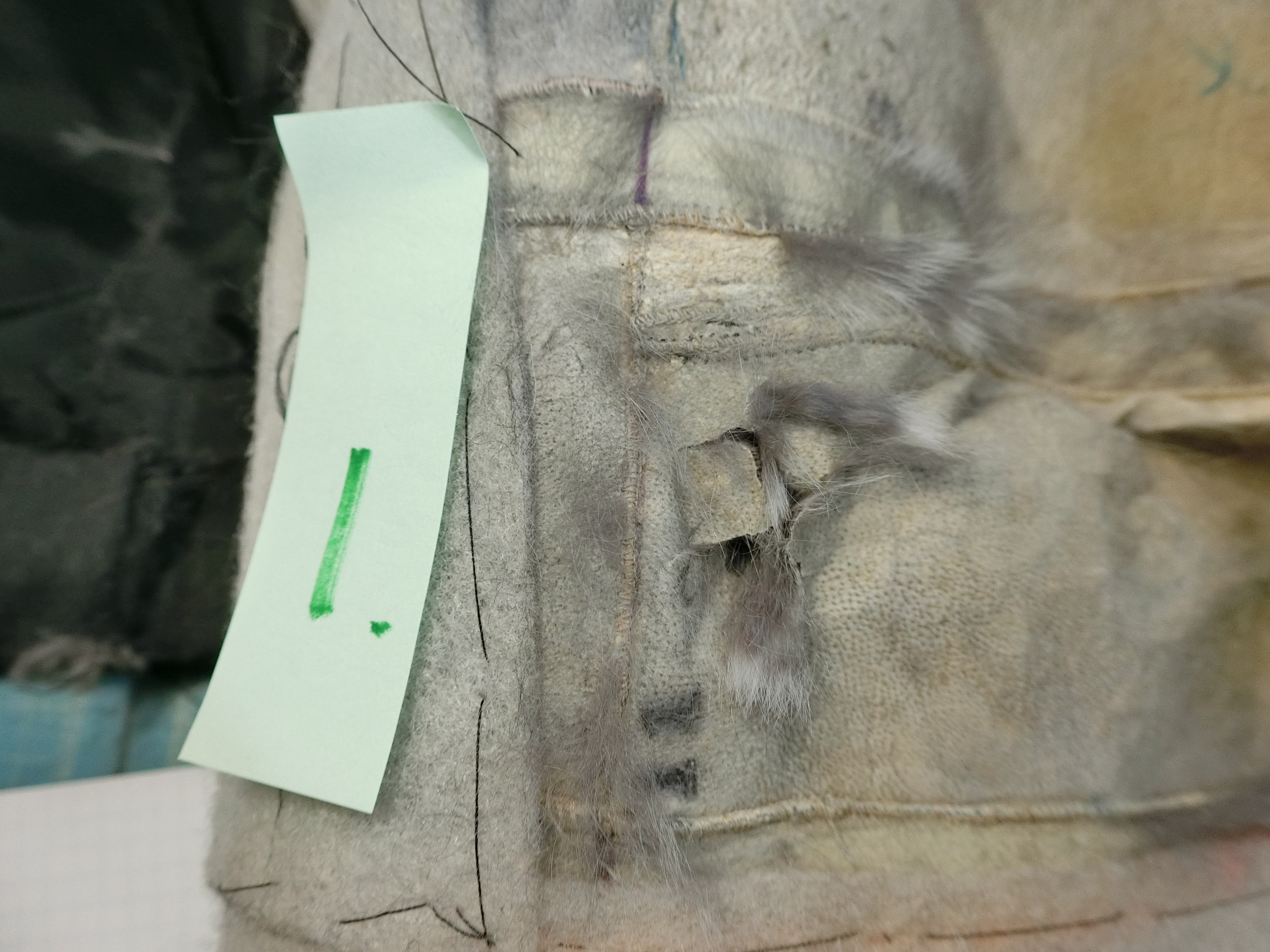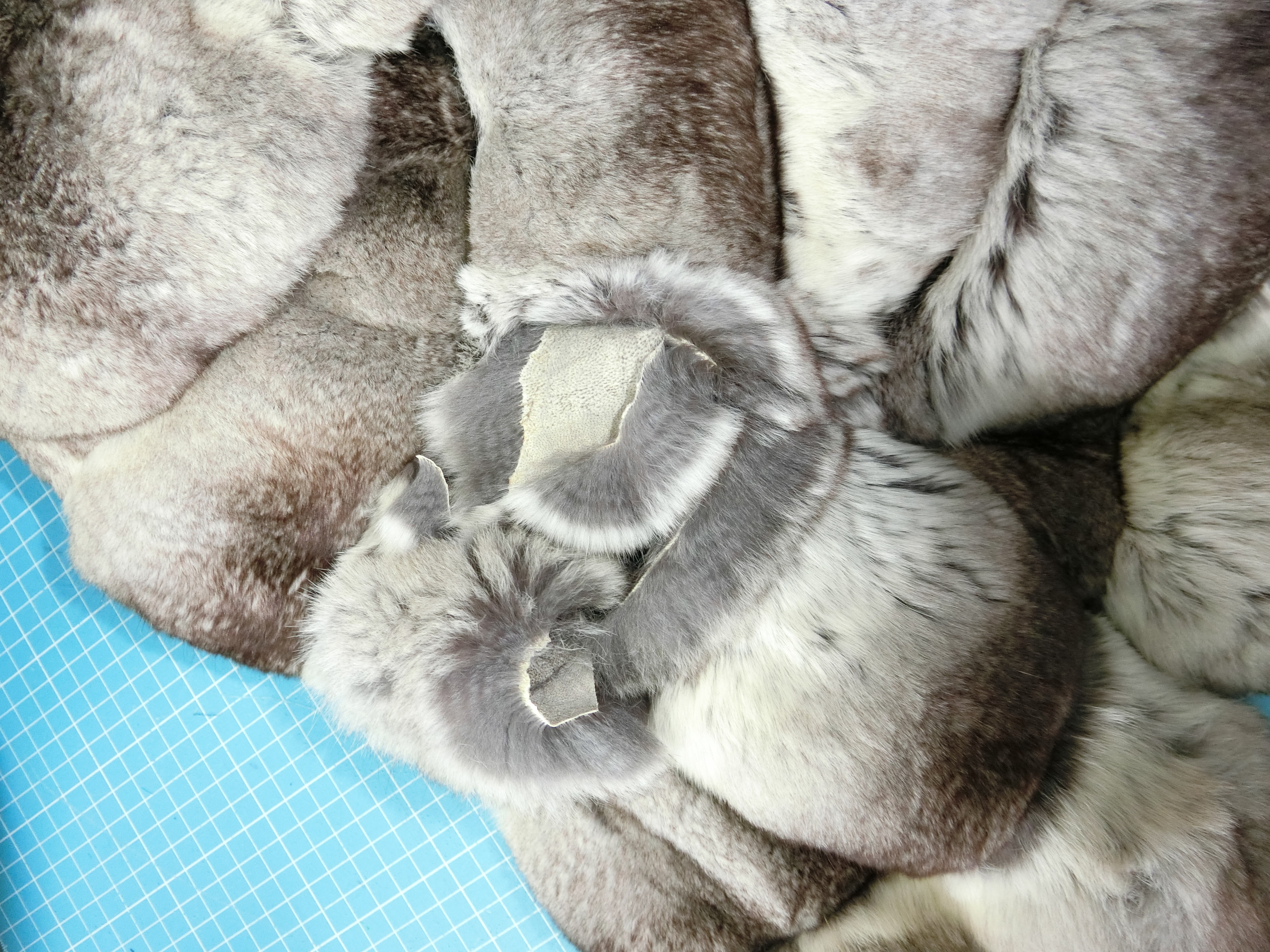 裏地と取って皮面からみると、毛面より複雑なヤブレ